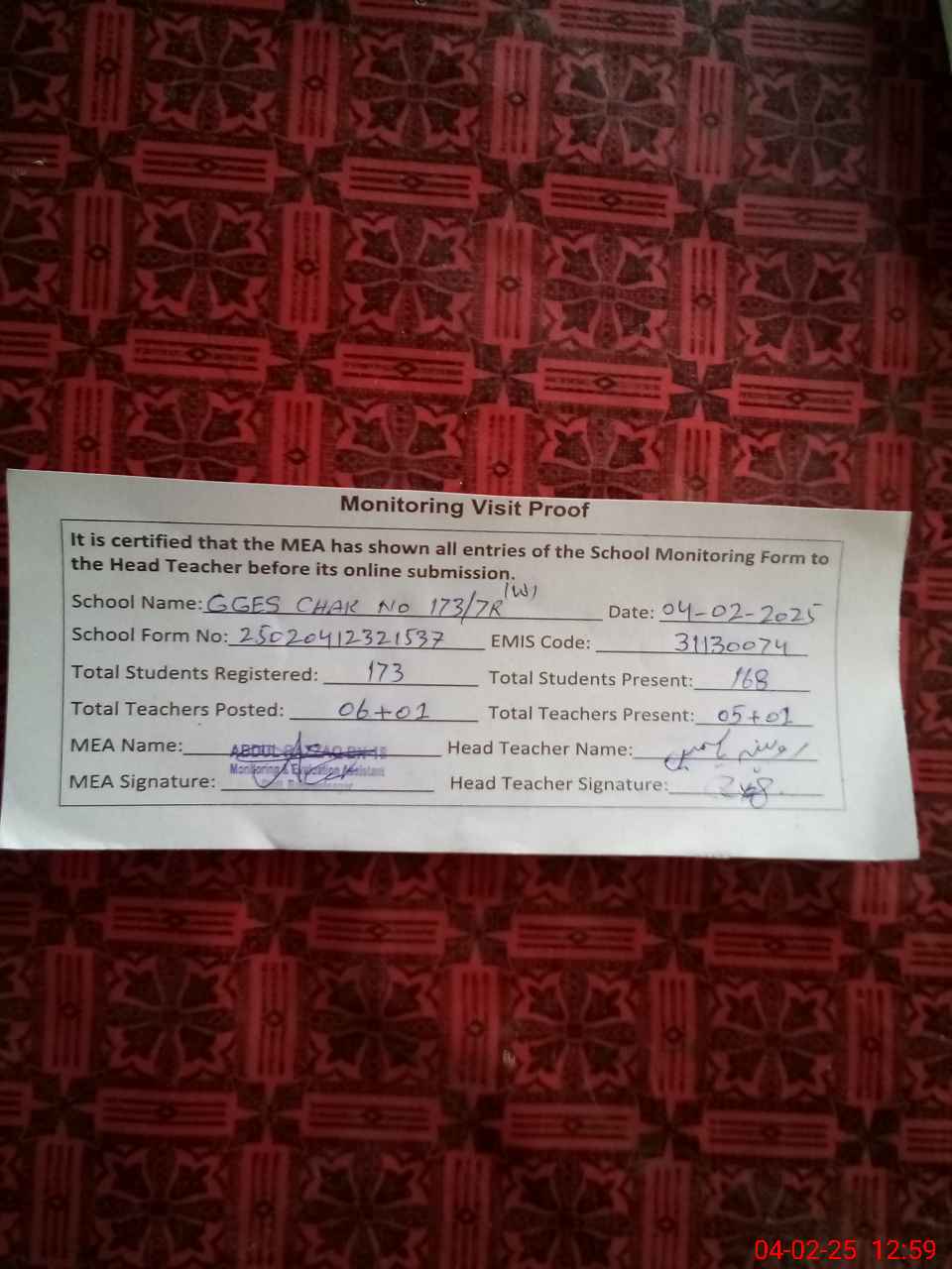 | EMIS Code: 31130074 | Name of School: GGES CHAK NO.173/7-R (W) | |||