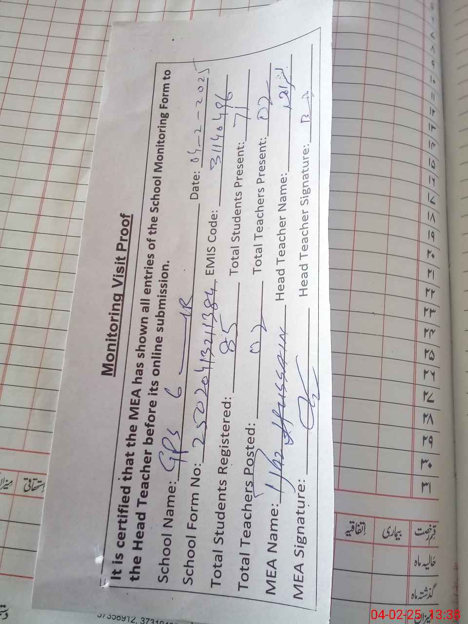 | Attendance Register | Head Teacher | MEA with School | Visit Proof |