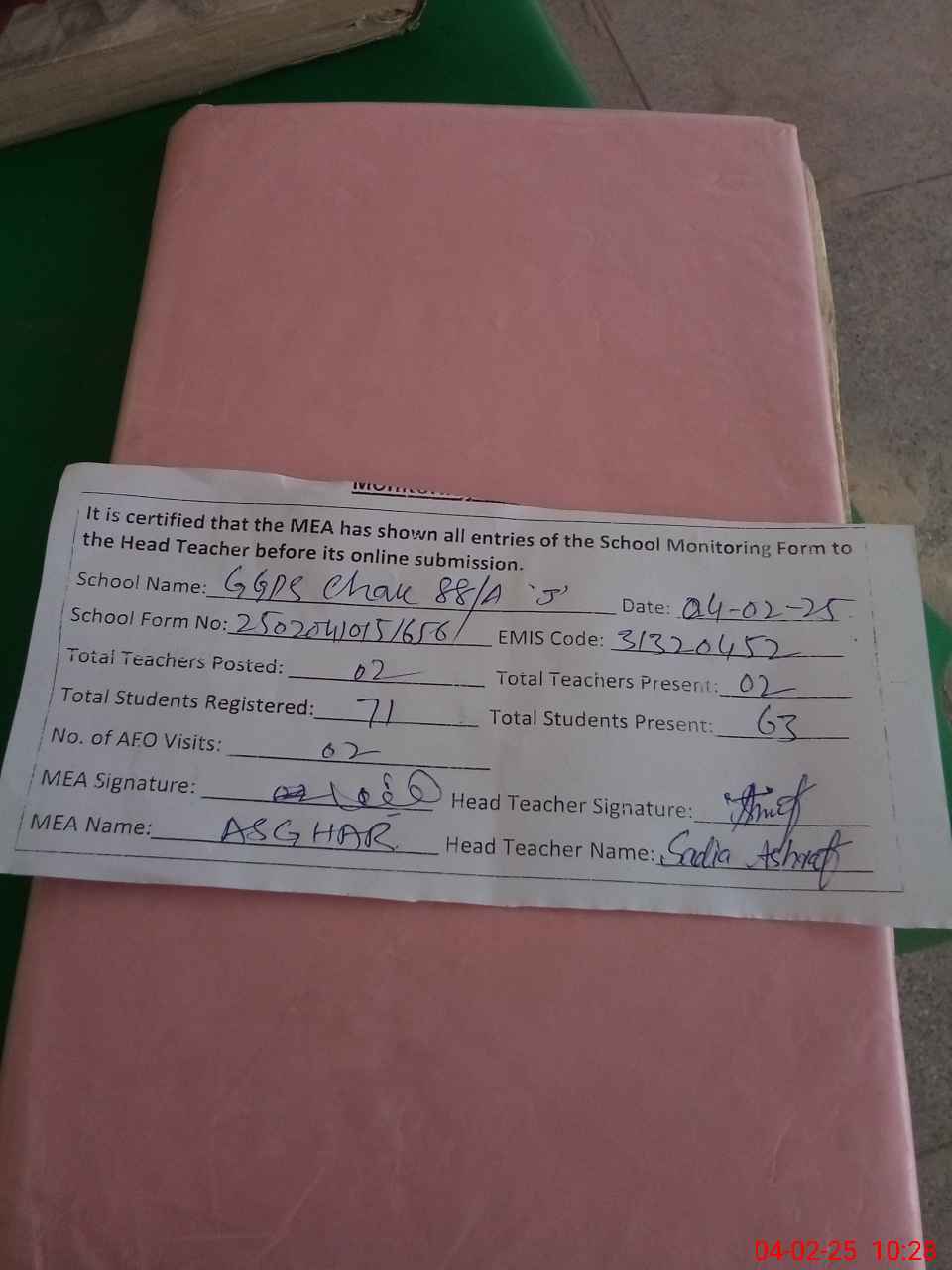 | EMIS Code: 31320452 | Name of School: GGPS CHAK NO. 88/A JADEED | |||