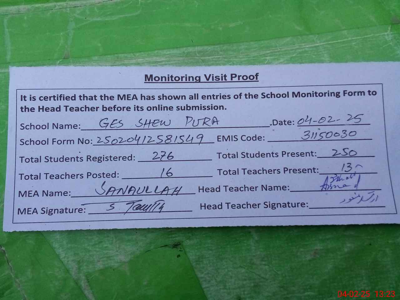 | EMIS Code: 31150030 | Name of School: GHS SHEW PURA | |||