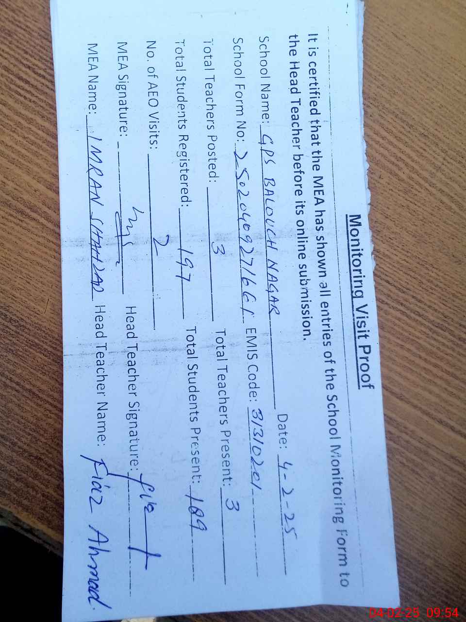 | EMIS Code: 31310201 | Name of School: GPS BALUCH NAGAR (After Noon) | |||