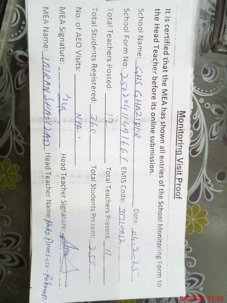 | Attendance Register | Head Teacher | MEA with School | Visit Proof |