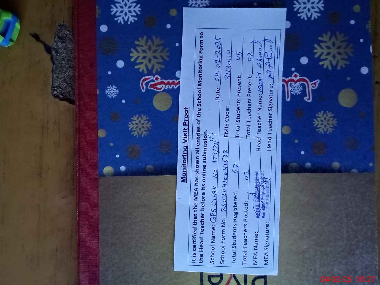 | Attendance Register | Head Teacher | MEA with School | Visit Proof |