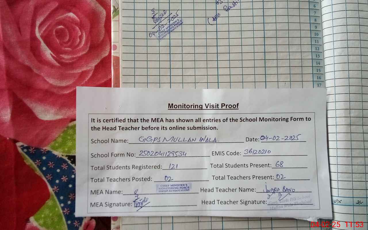 | EMIS Code: 36120210 | Name of School: GGPS MULLAN WALA SHUJABAD | |||