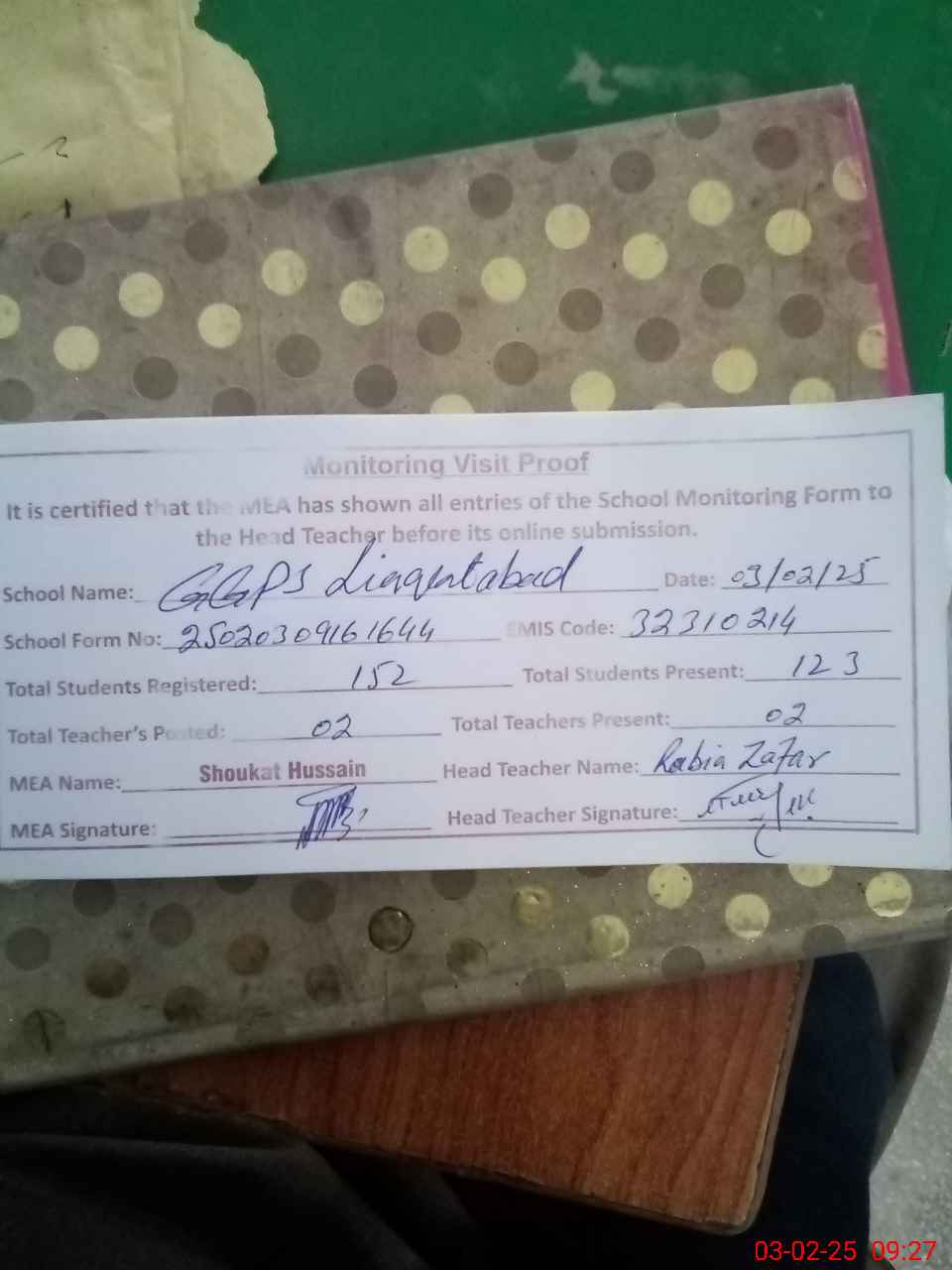 | Attendance Register | Head Teacher | MEA with School | Visit Proof |