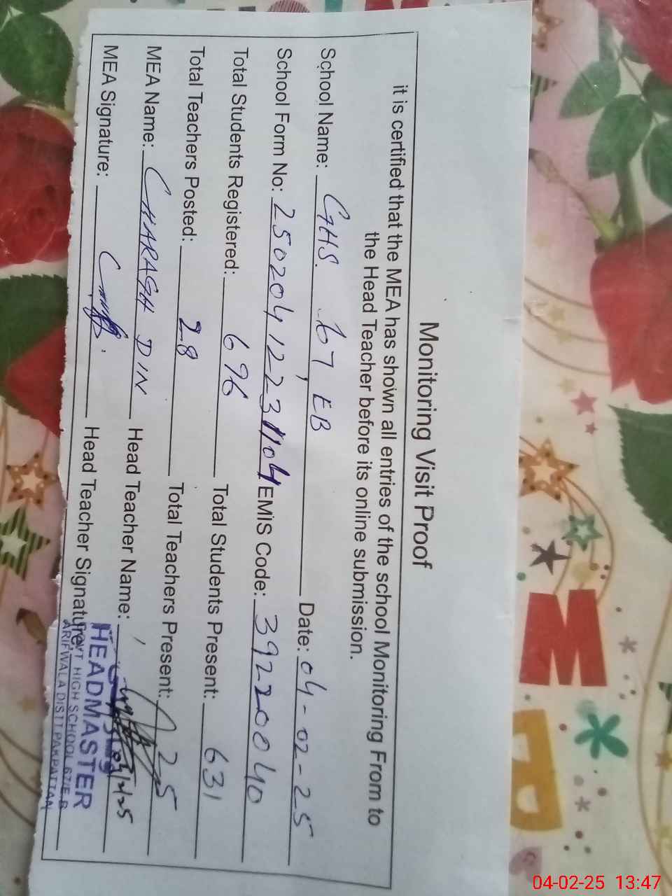 | EMIS Code: 39220040 | Name of School: GHS 67 EB | |||
