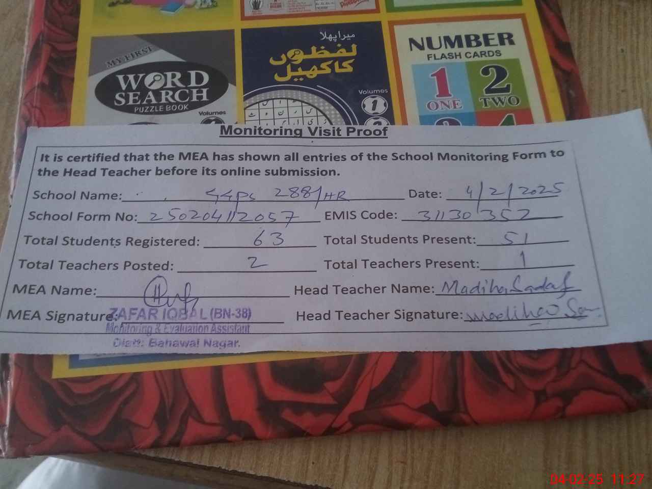 | EMIS Code: 31130352 | Name of School: GGPS CHAK NO 288 HR | |||