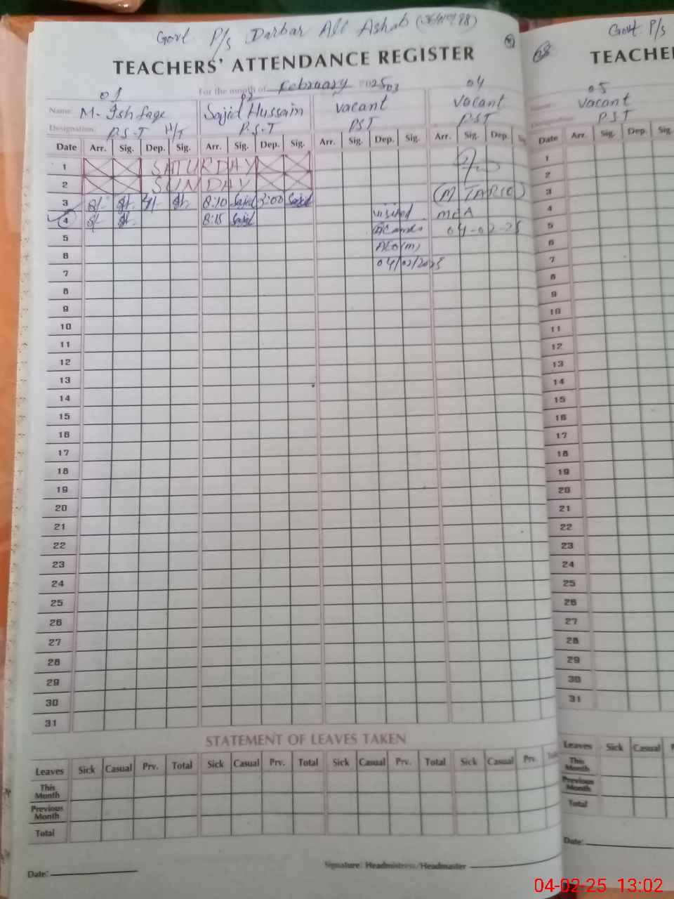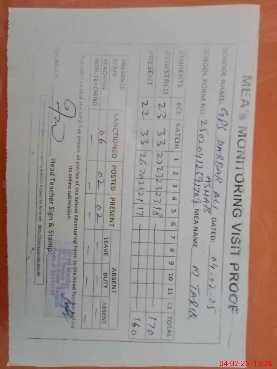 | Attendance Register | Head Teacher | MEA with School | Visit Proof |
