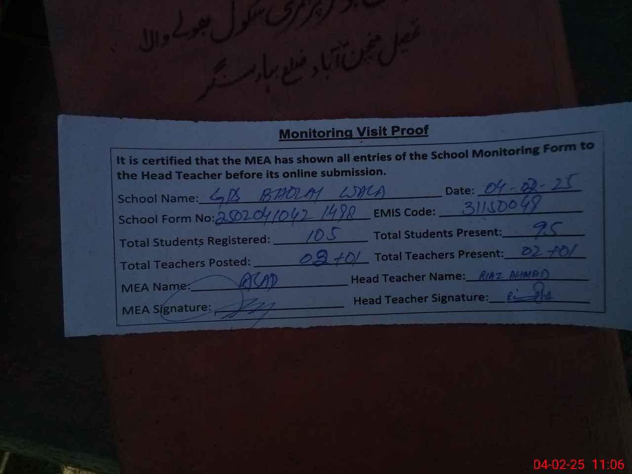 | Attendance Register | Head Teacher | MEA with School | Visit Proof |