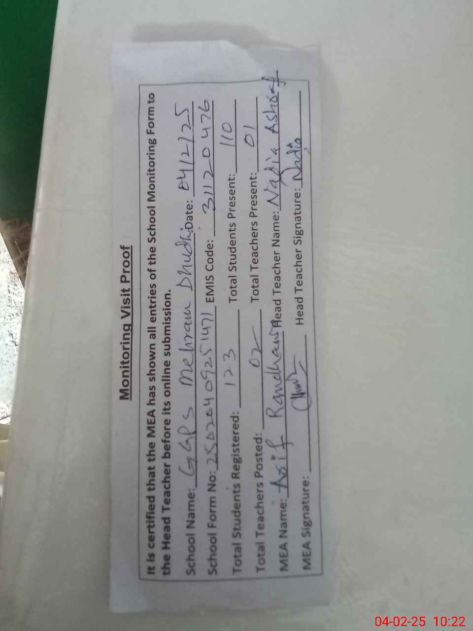 | Attendance Register | Head Teacher | MEA with School | Visit Proof |
