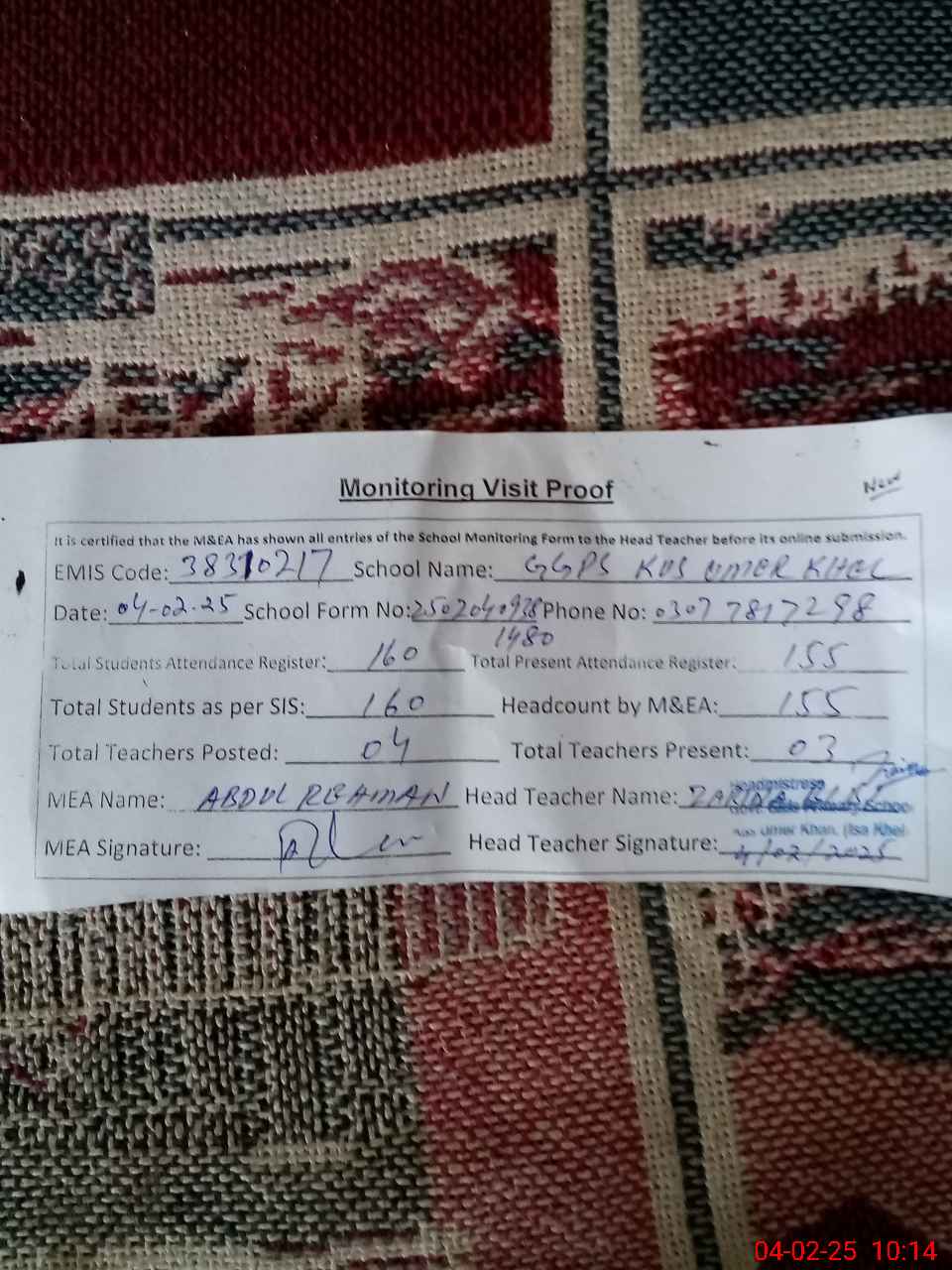 | Attendance Register | Head Teacher | MEA with School | Visit Proof |