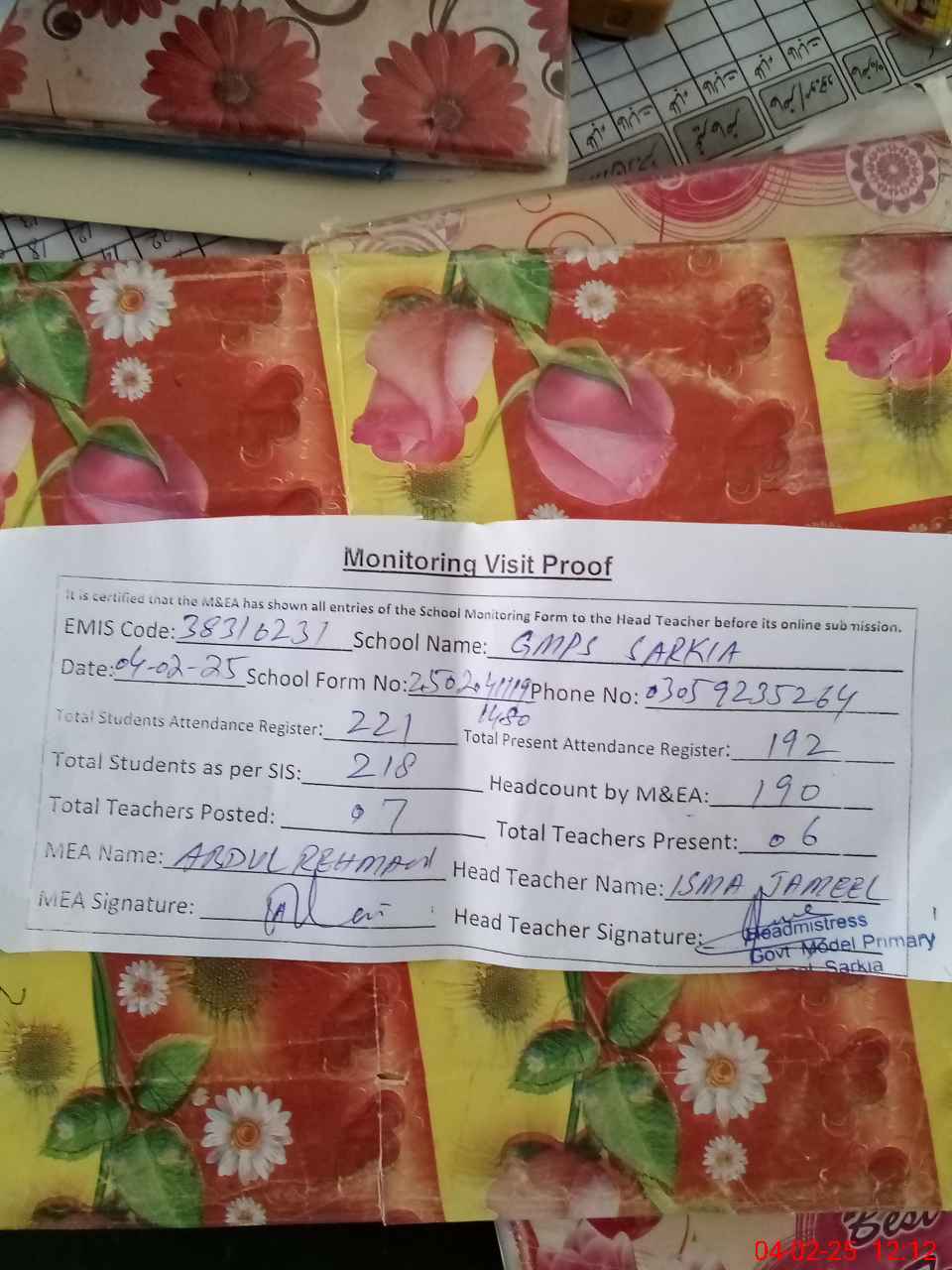 | Attendance Register | Head Teacher | MEA with School | Visit Proof |