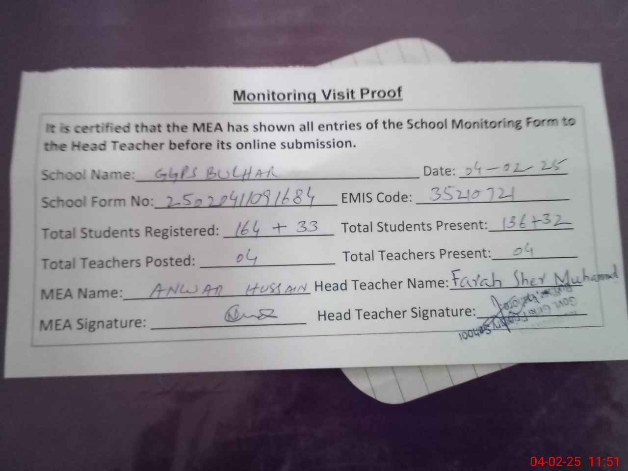 | Attendance Register | Head Teacher | MEA with School | Visit Proof |