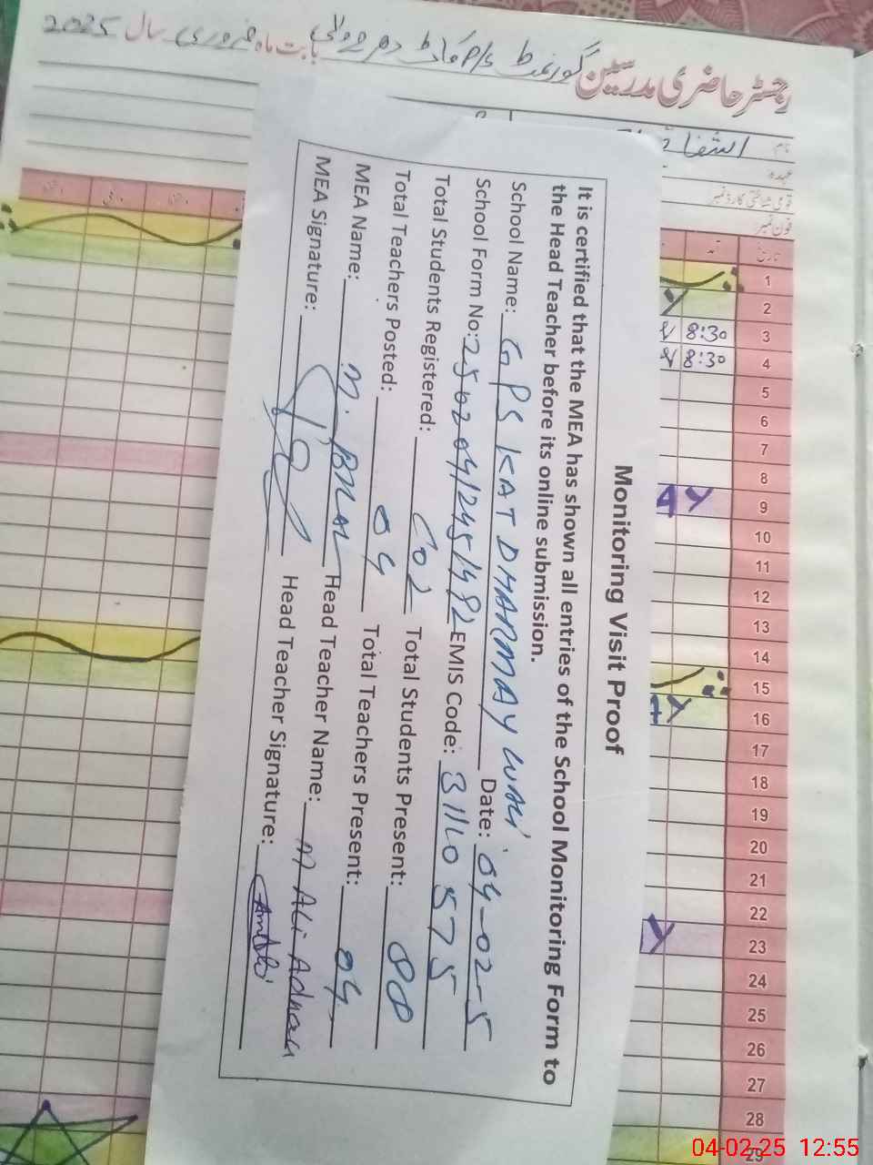 | Attendance Register | Head Teacher | MEA with School | Visit Proof |