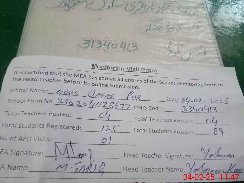| EMIS Code: 31340413 | Name of School: GGPS JAFAR PUR | |||