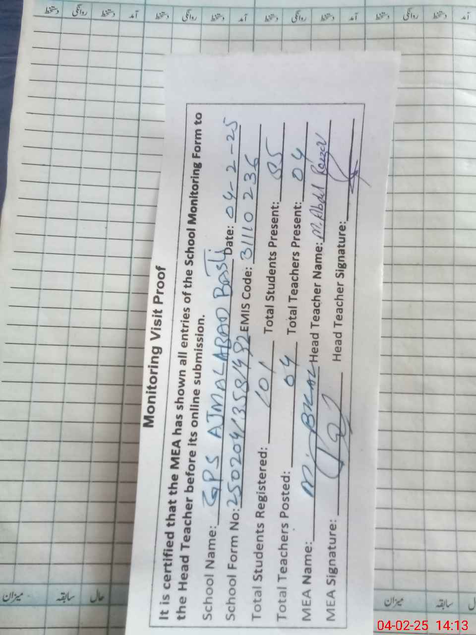 | EMIS Code: 31110236 | Name of School: GPS AJMAL ABAD (BASTI HAZOORA) | |||