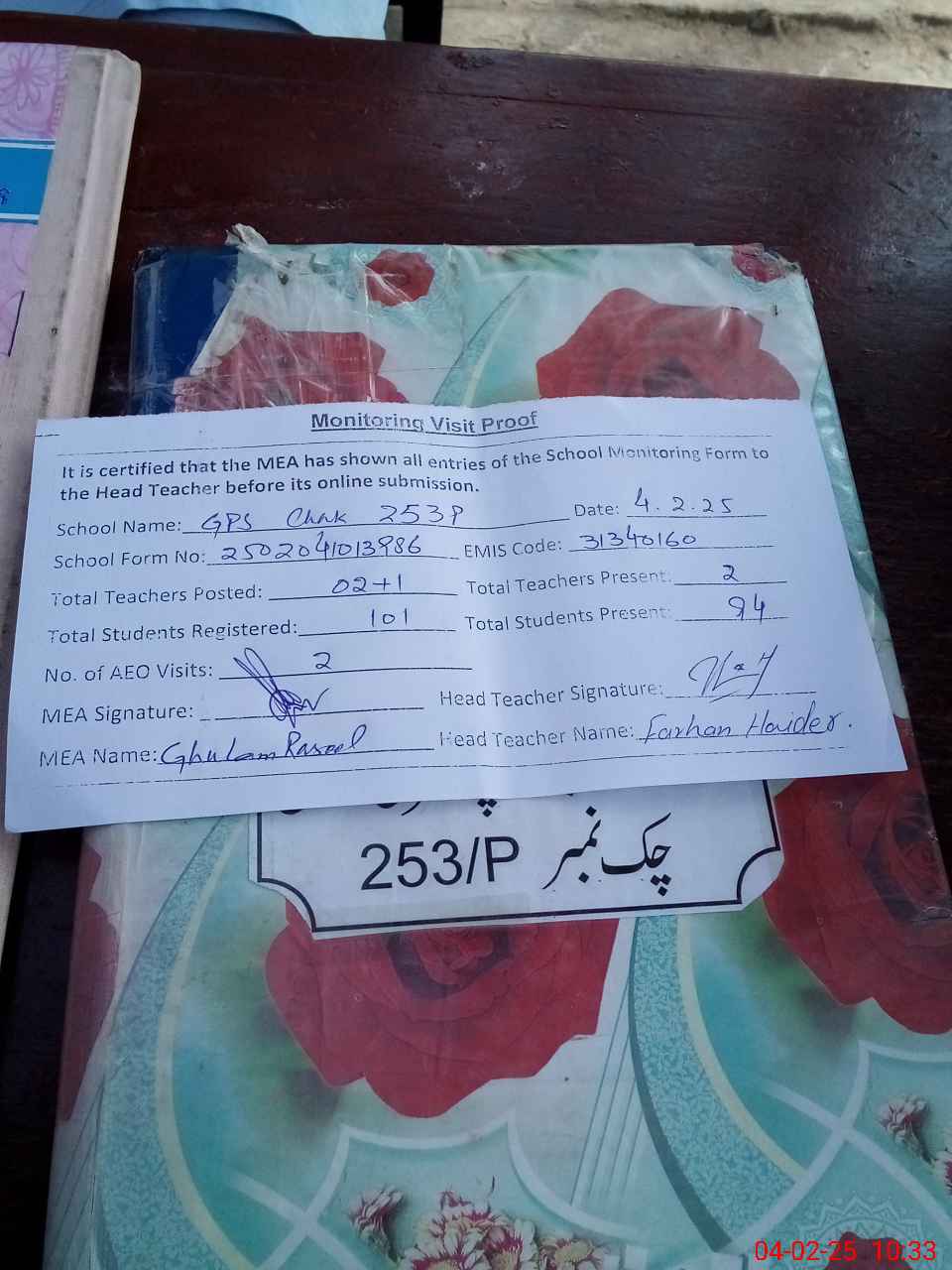 | EMIS Code: 31340160 | Name of School: GPS CHAK NO 253/P | |||