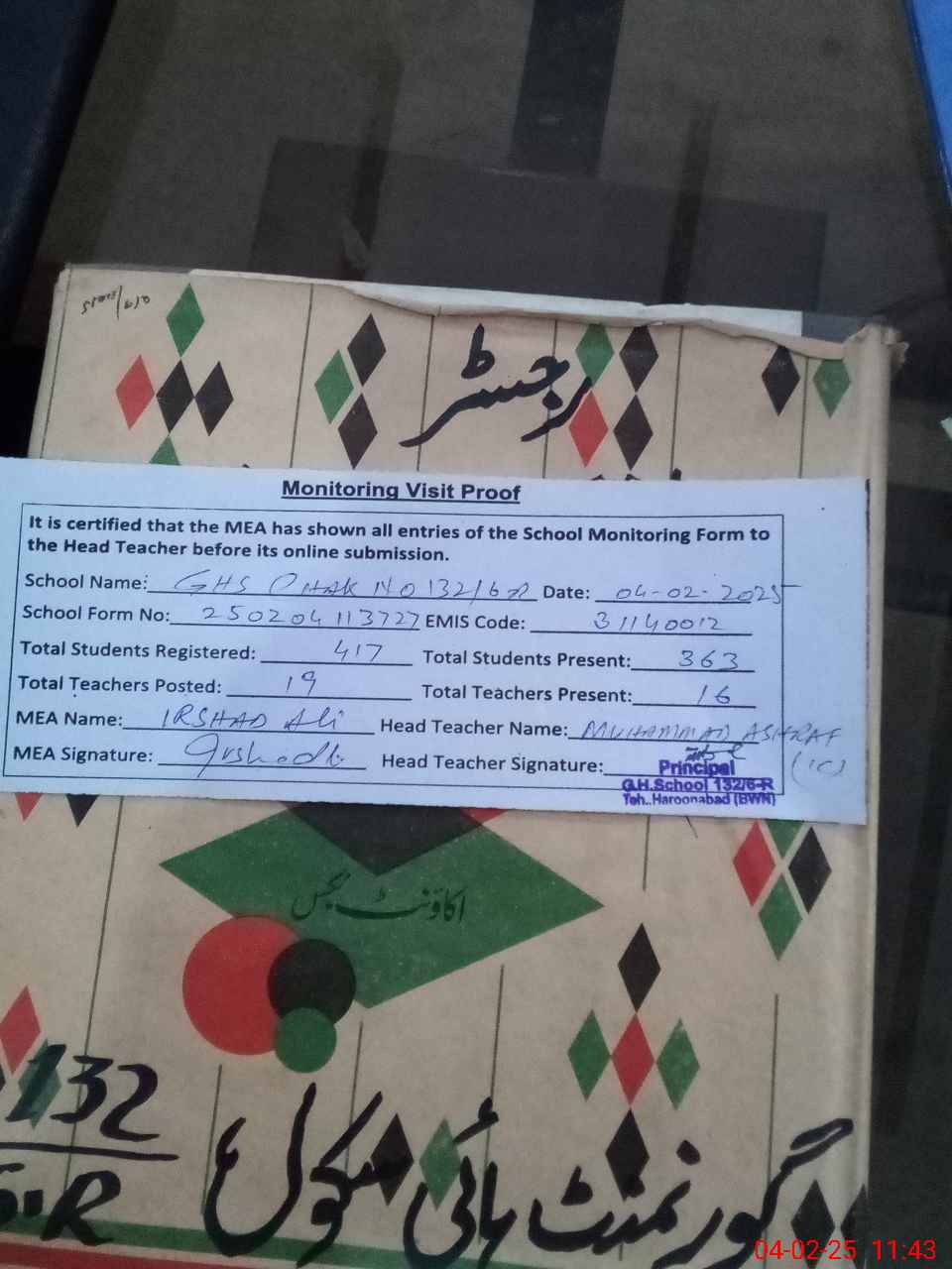 | EMIS Code: 31140012 | Name of School: GHS CHAK NO. 132/6R | |||