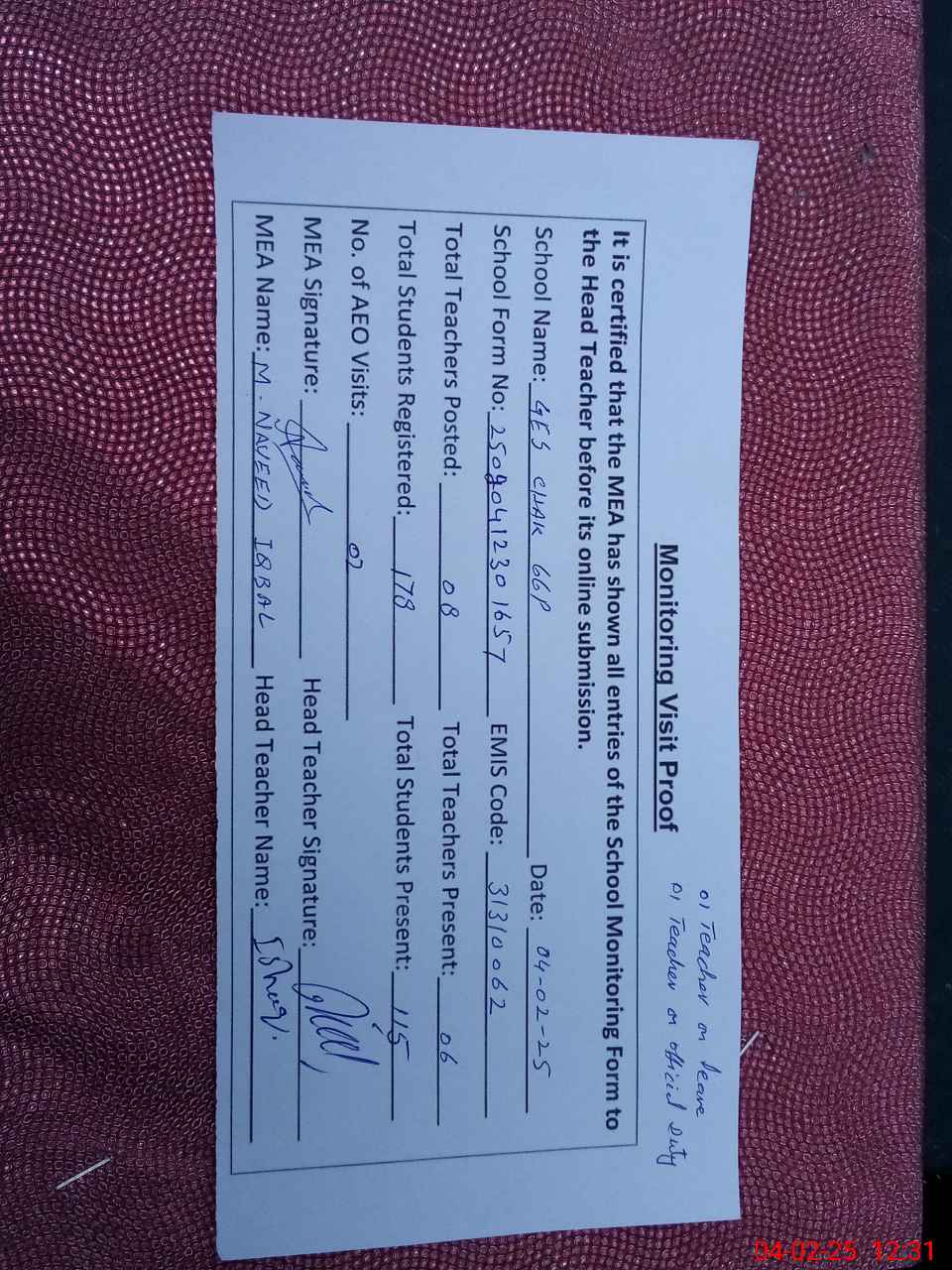 | Attendance Register | Head Teacher | MEA with School | Visit Proof |