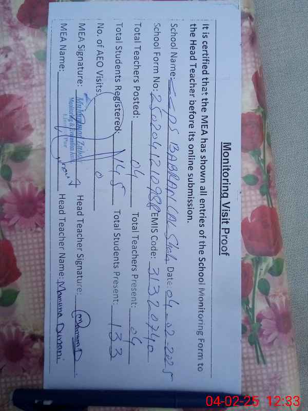| Attendance Register | Head Teacher | MEA with School | Visit Proof |