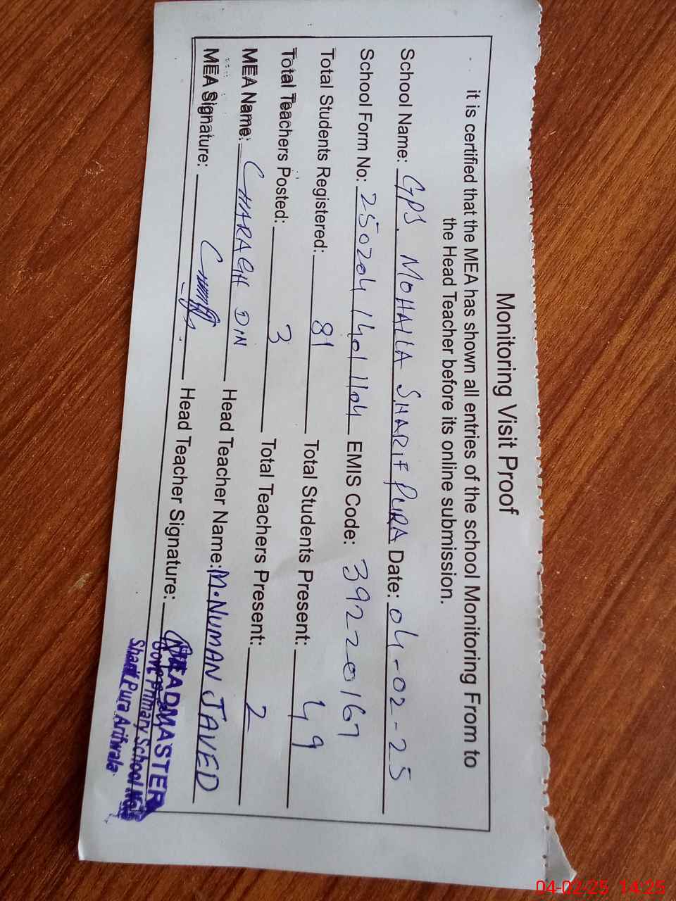 | EMIS Code: 39220167 | Name of School: GPS MOHALLA SHARIF PURA | |||