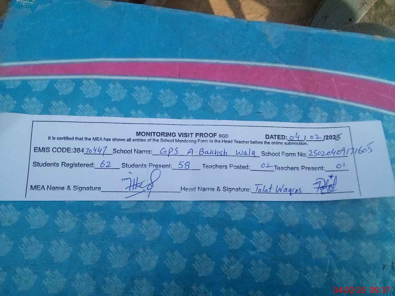 | EMIS Code: 38470447 | Name of School: GPS ALLAH BAKHSH WALA | |||