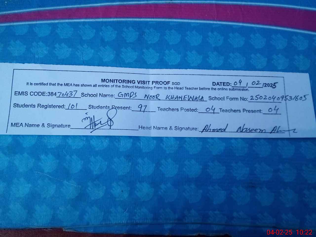 | EMIS Code: 38470437 | Name of School: GMPS NOOR KHAN-E-WALA | |||