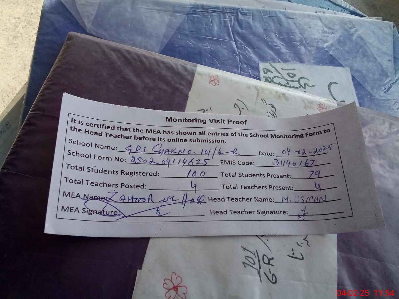 | EMIS Code: 31140167 | Name of School: GPS CHAK NO. 101/6-R | |||