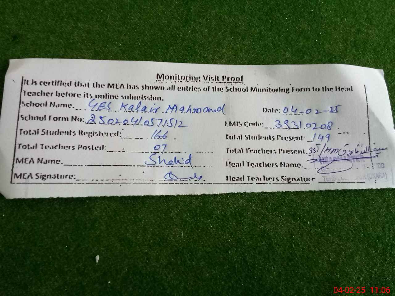 | Attendance Register | Head Teacher | MEA with School | Visit Proof |