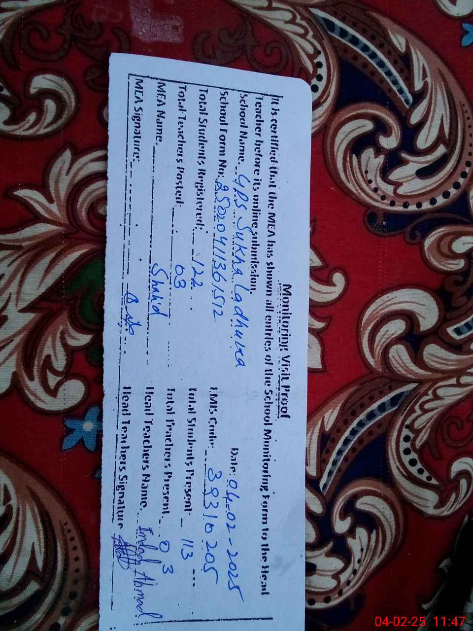 | Attendance Register | Head Teacher | MEA with School | Visit Proof |