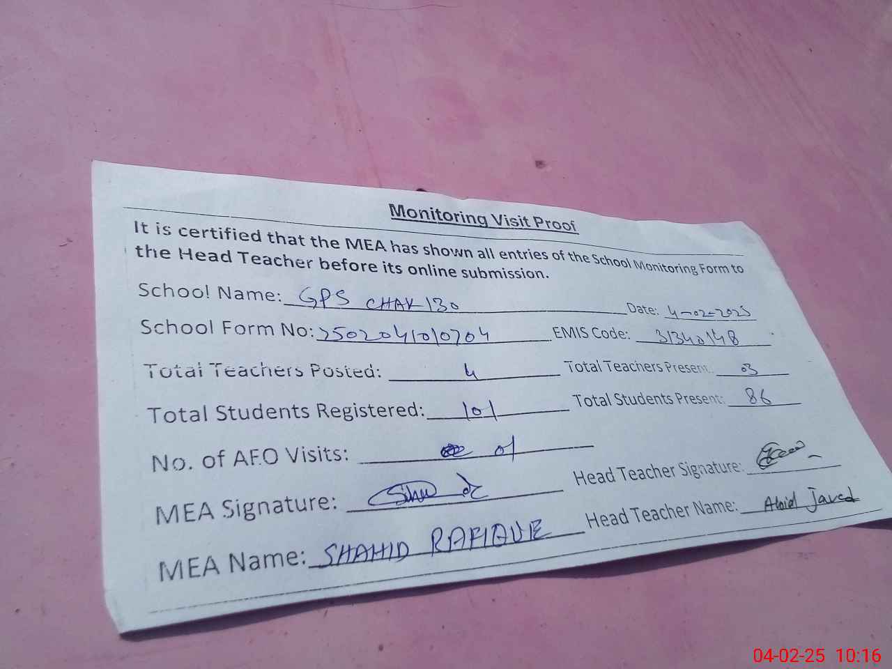 | Attendance Register | Head Teacher | MEA with School | Visit Proof |