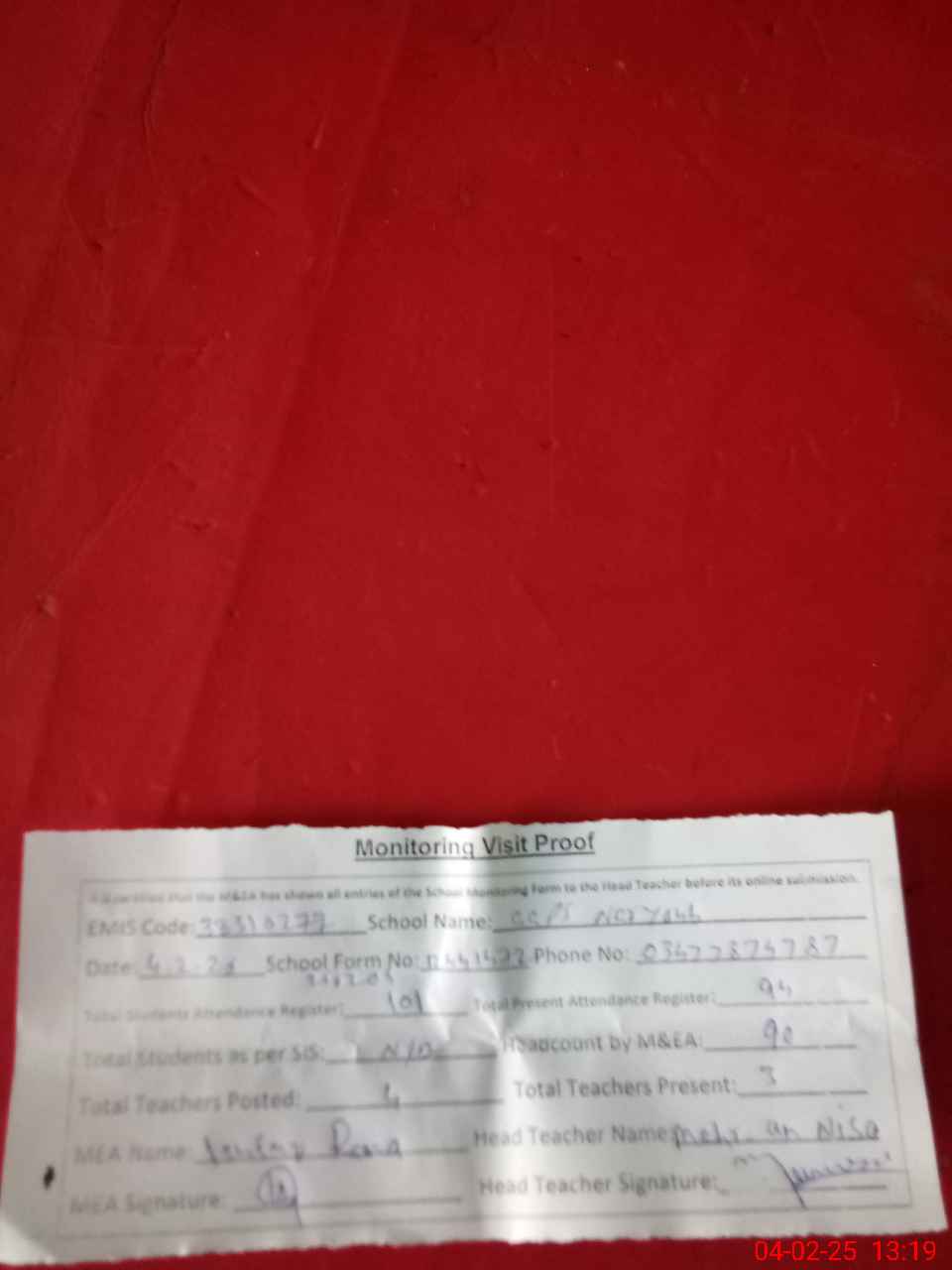 | Attendance Register | Head Teacher | MEA with School | Visit Proof |