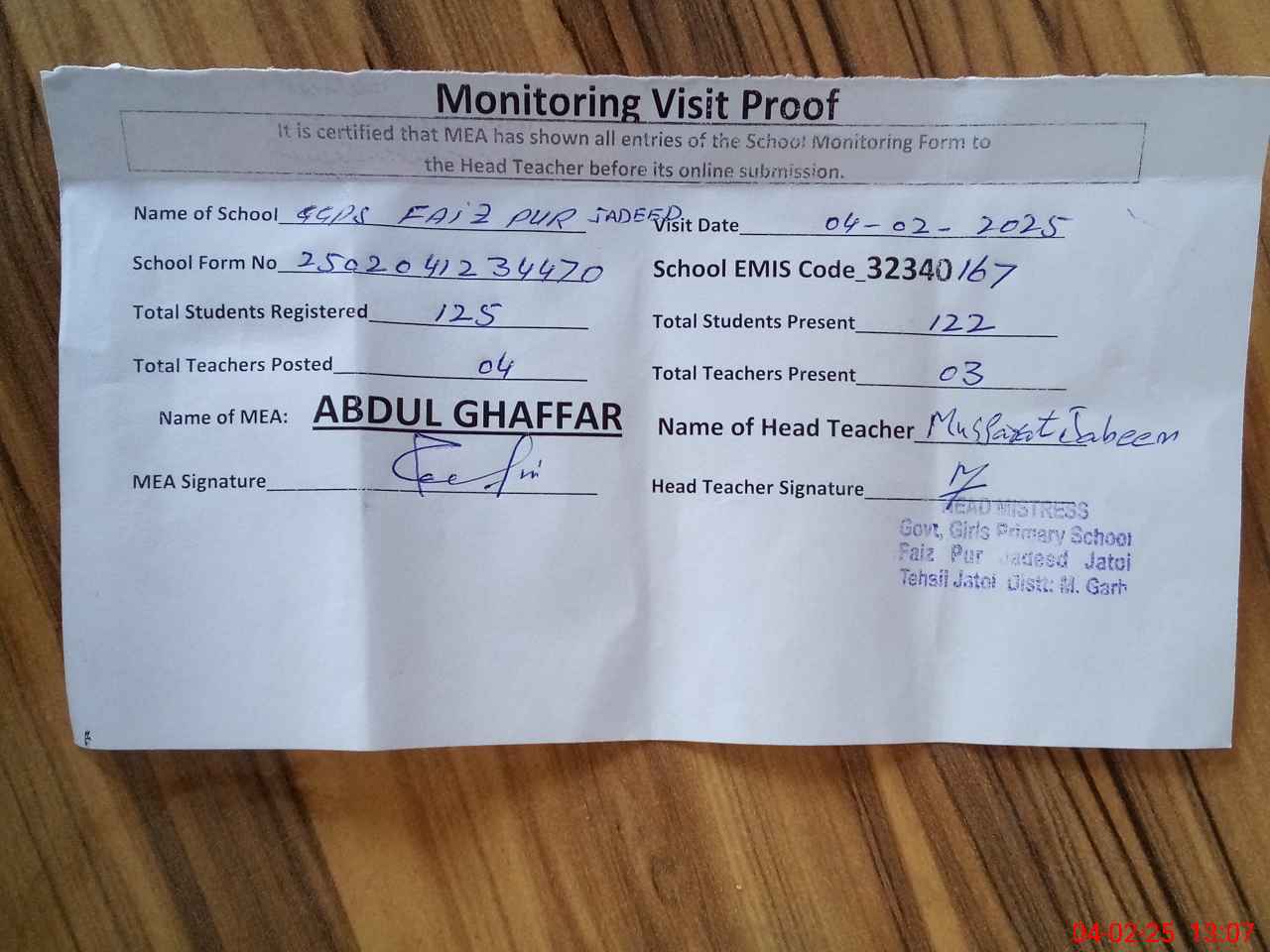 | EMIS Code: 32340167 | Name of School: GGPS FAIZ PUR JADEED | |||