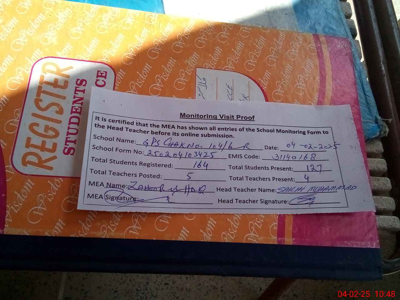 | EMIS Code: 31140168 | Name of School: GPS CHAK NO 104/6-R | |||