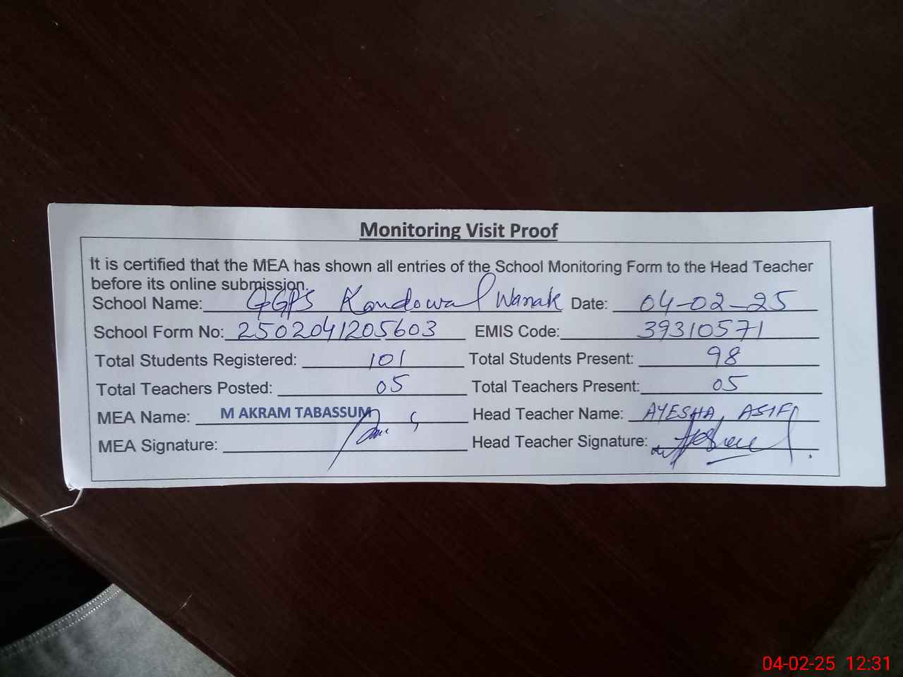 | EMIS Code: 39310571 | Name of School: GGPS KANDO WAL WANAIK | |||