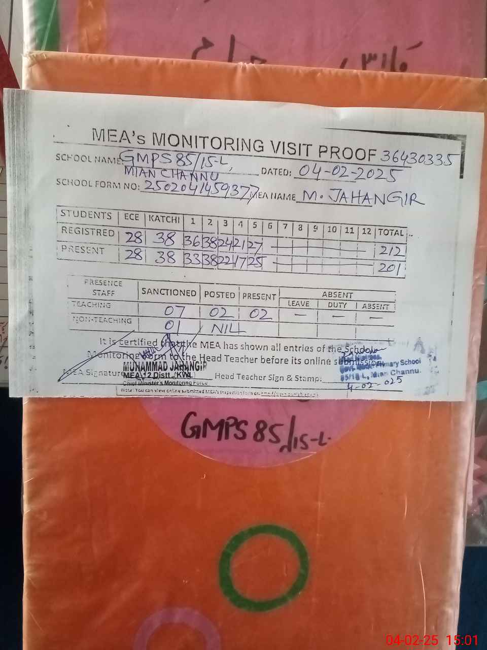 | Attendance Register | Head Teacher | MEA with School | Visit Proof |