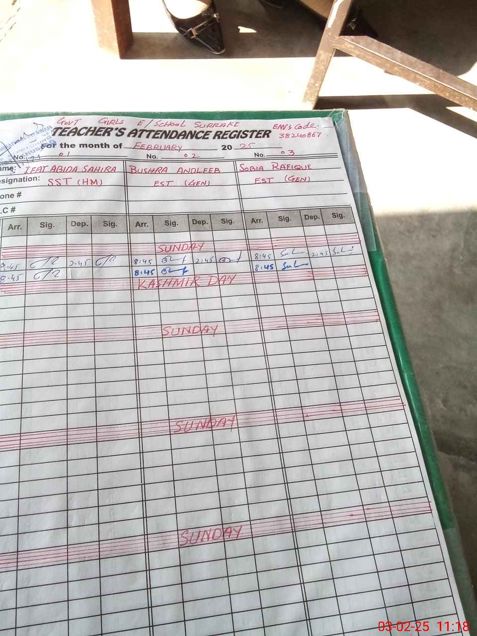 | CNIC | Full Name | Designation | R/C | Absence during last cal. month |