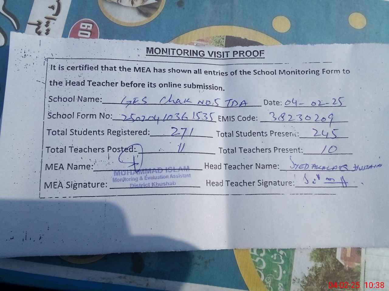 | Attendance Register | Head Teacher | MEA with School | Visit Proof |