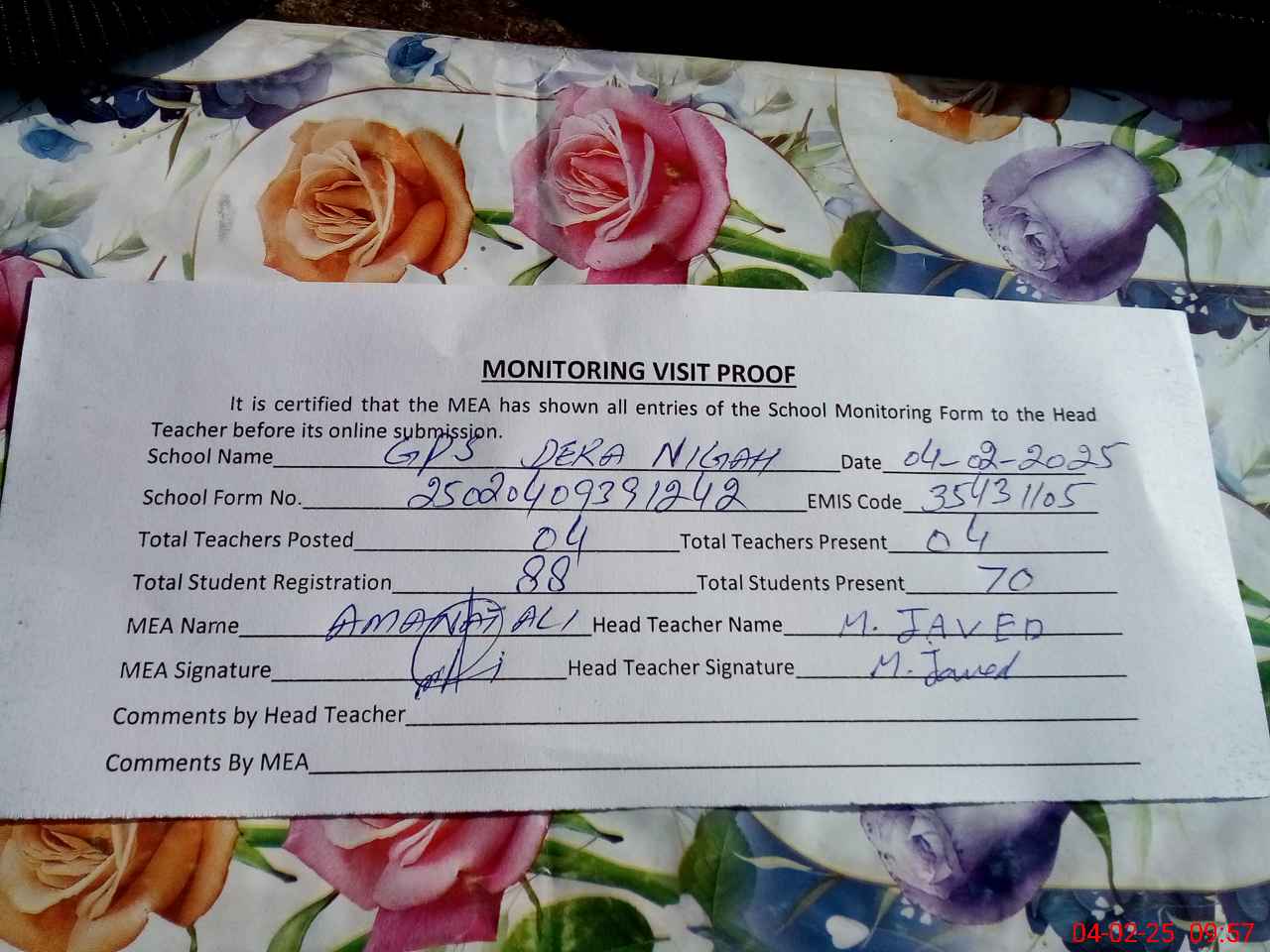 | Attendance Register | Head Teacher | MEA with School | Visit Proof |