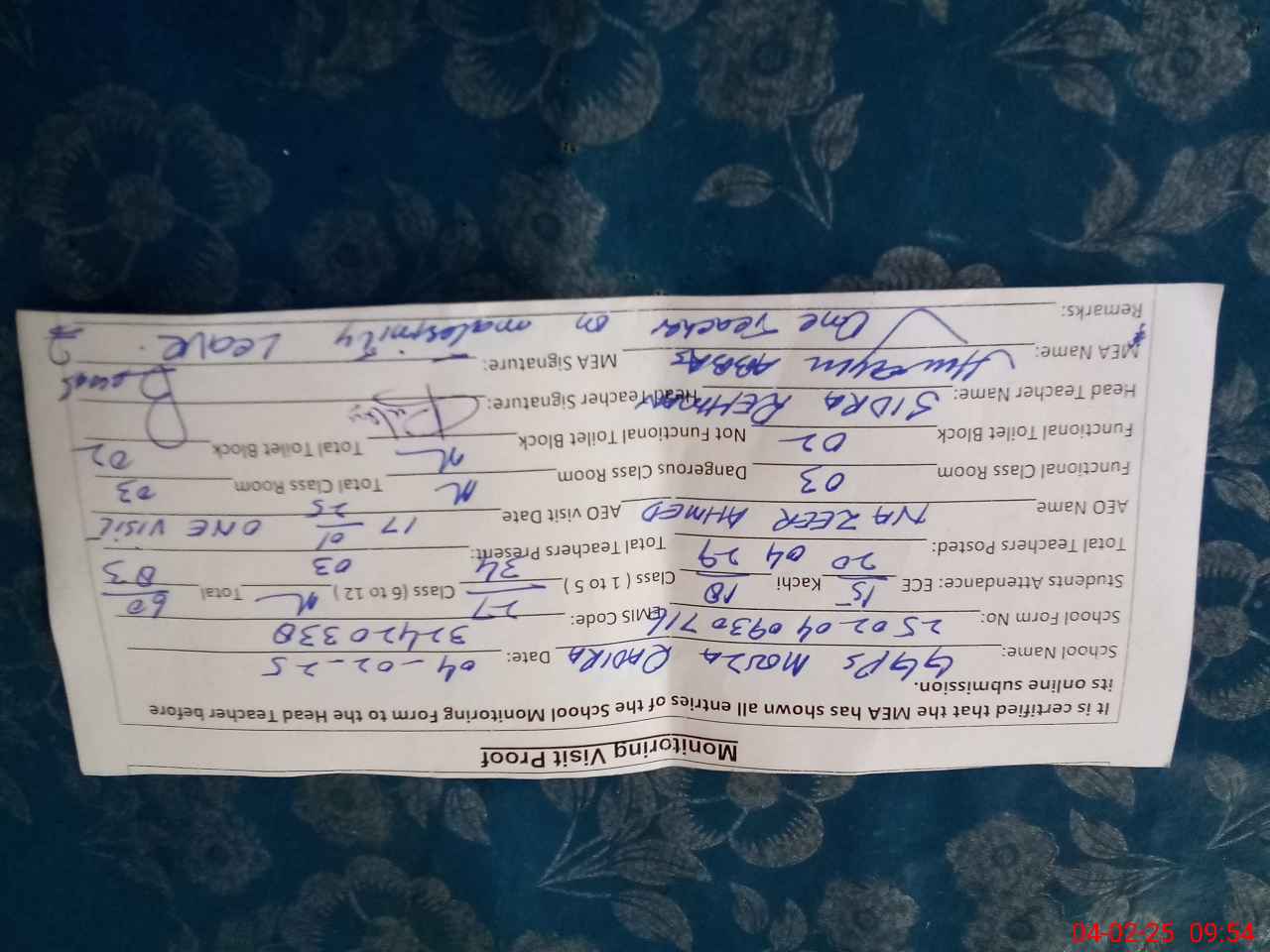 | Remarks (Use Separate Page if Required): One teacher on maternity leave Sohail Asfand security Guard Absent over All cleaness Good students presence low | |||||