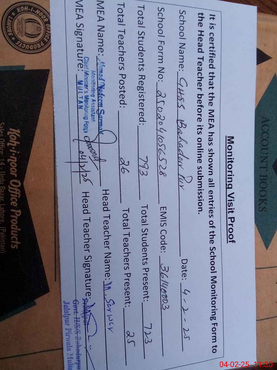 | Attendance Register | Head Teacher | MEA with School | Visit Proof |