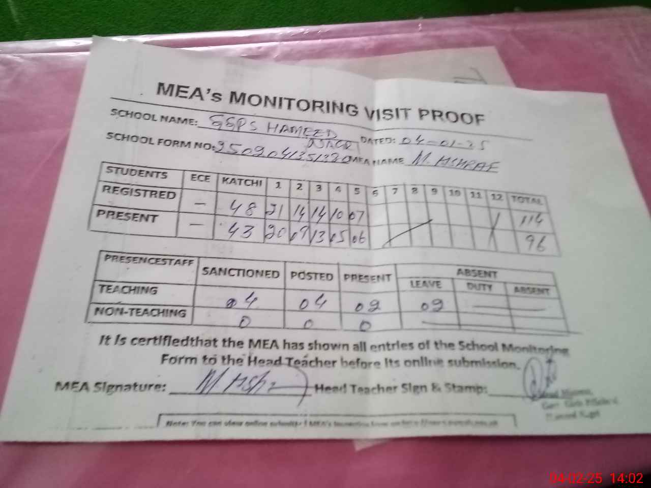 | Attendance Register | Head Teacher | MEA with School | Visit Proof |