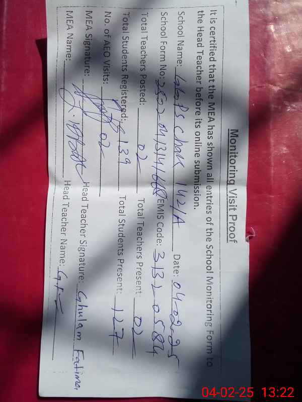| Attendance Register | Head Teacher | MEA with School | Visit Proof |