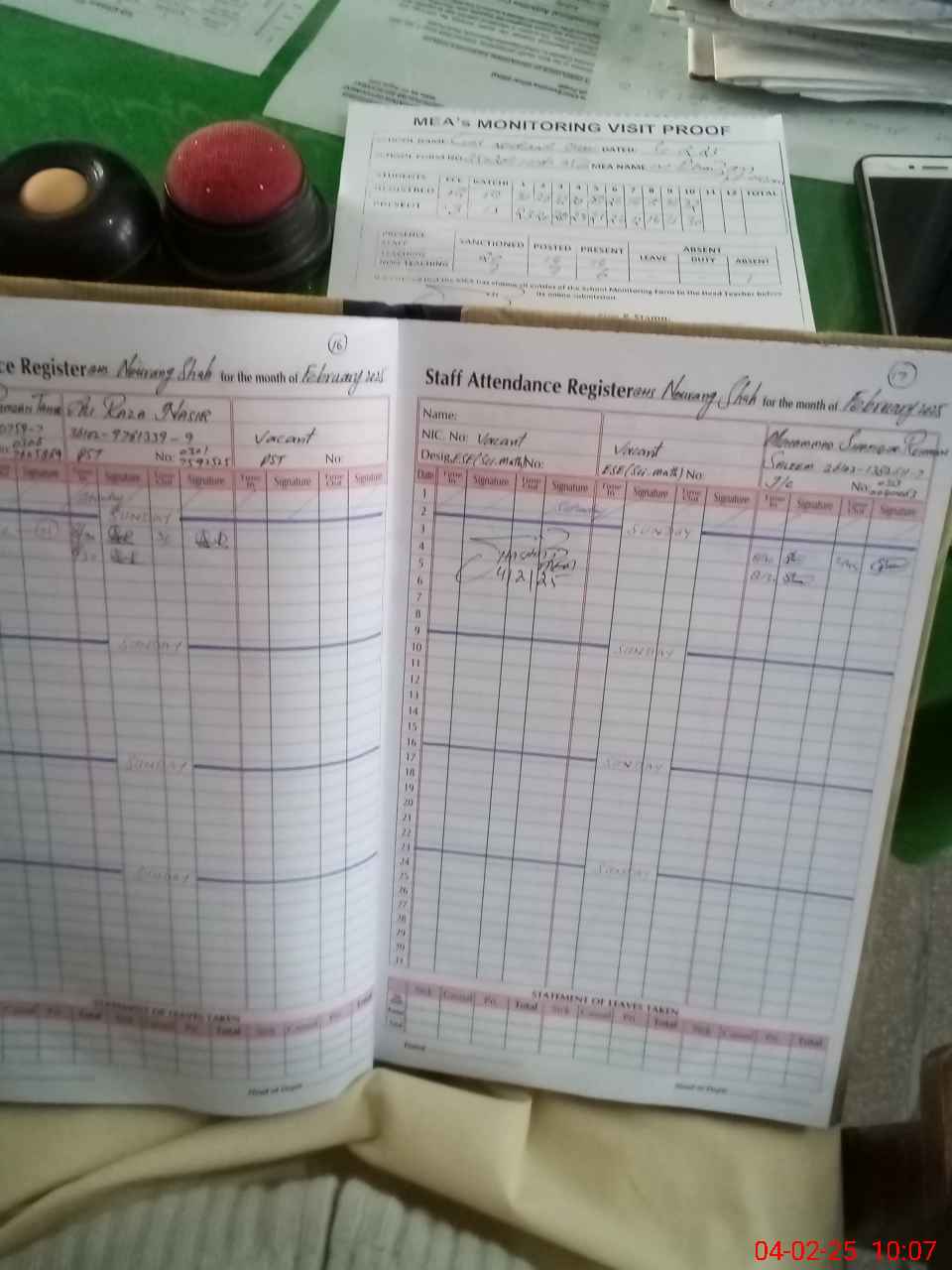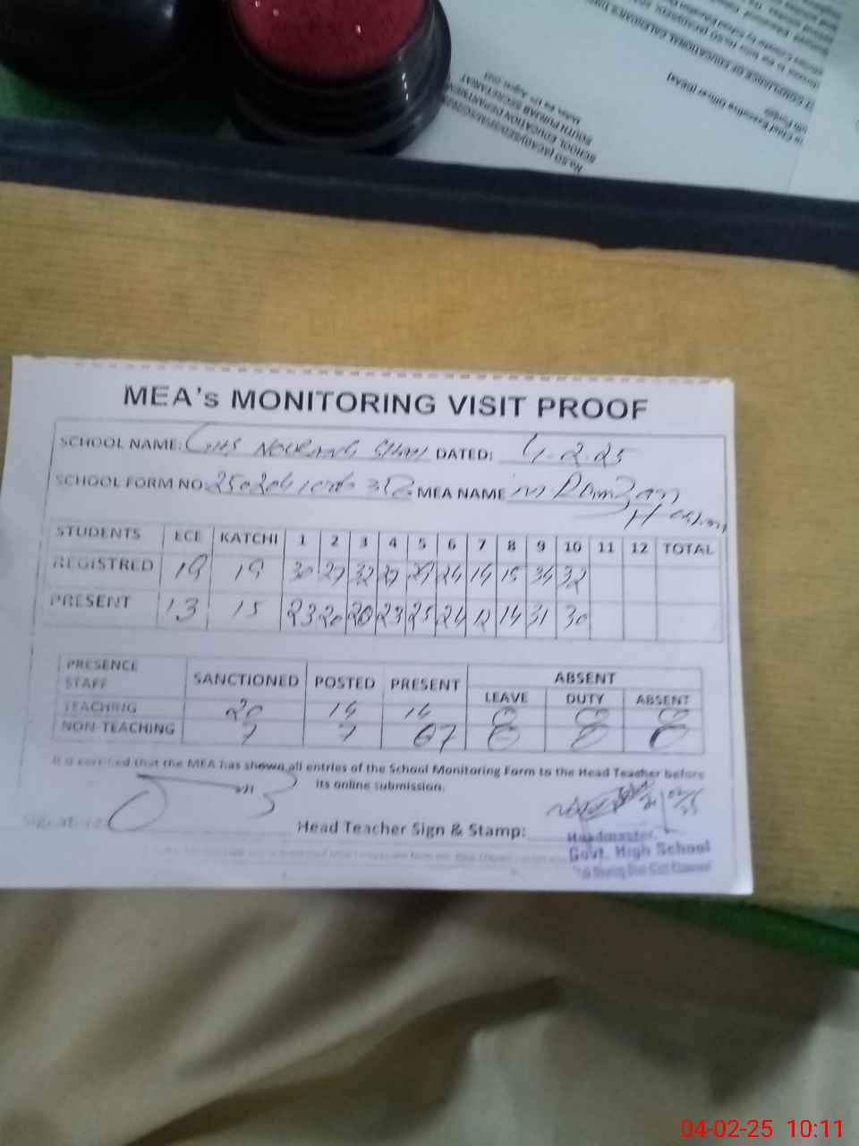 | Attendance Register | Head Teacher | MEA with School | Visit Proof |