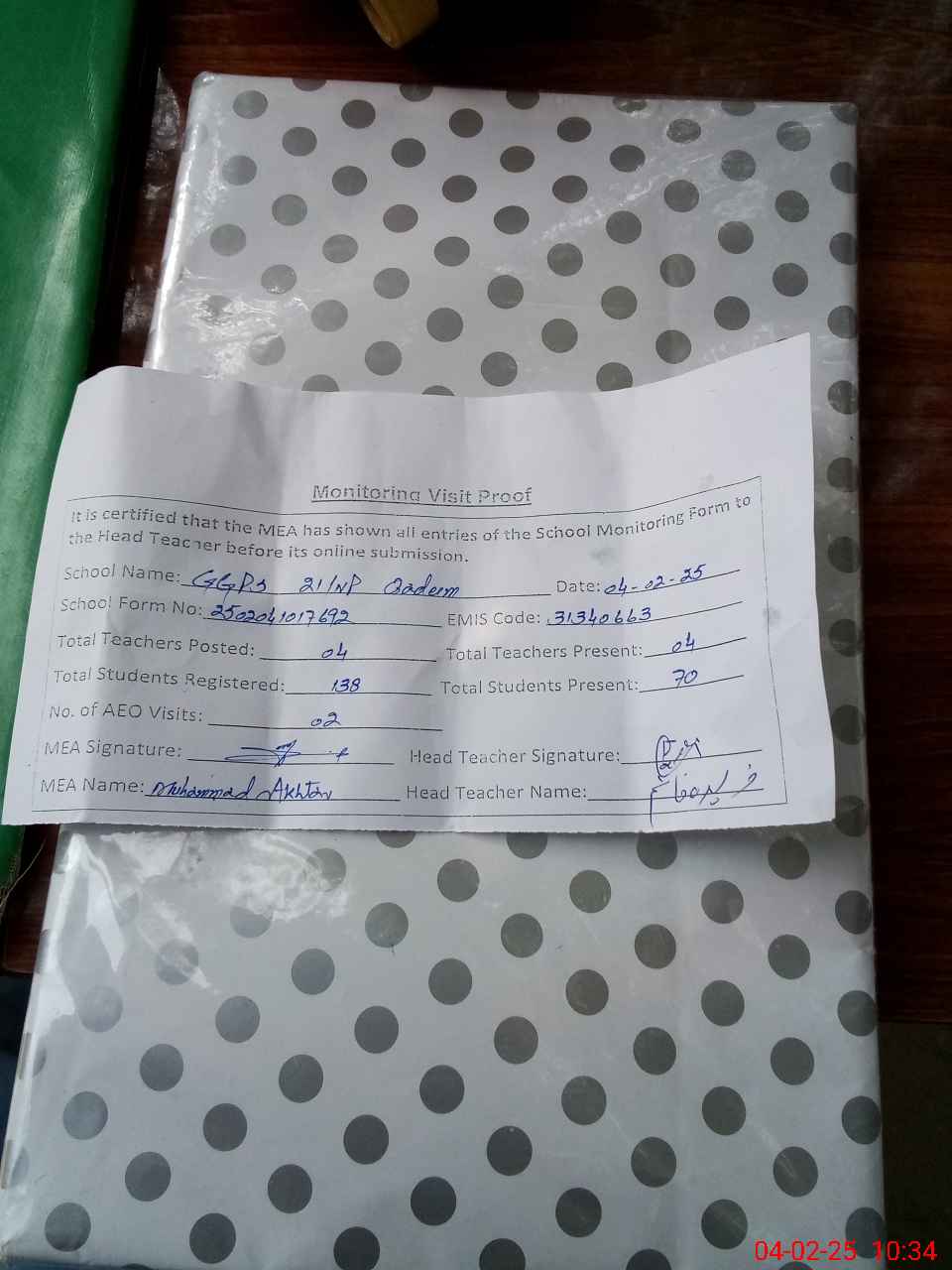 | Attendance Register | Head Teacher | MEA with School | Visit Proof |