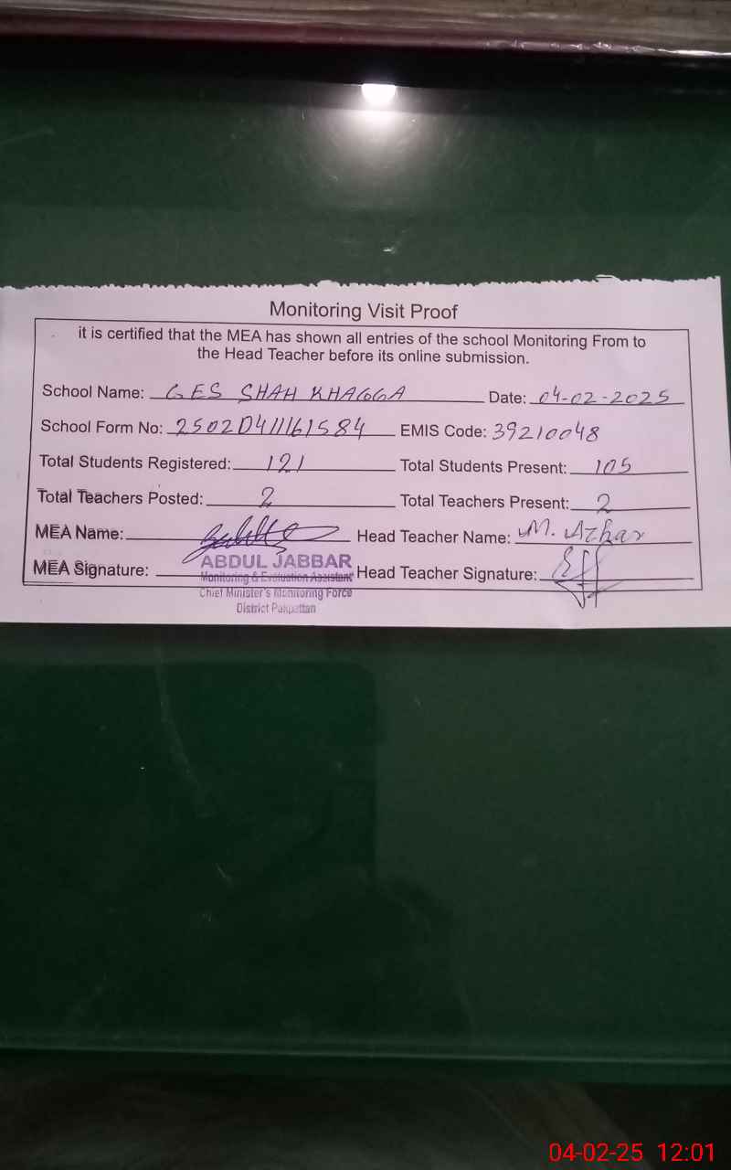 | EMIS Code: 39210048 | Name of School: GES SHAH KHAGGA PAKPATTAN | |||