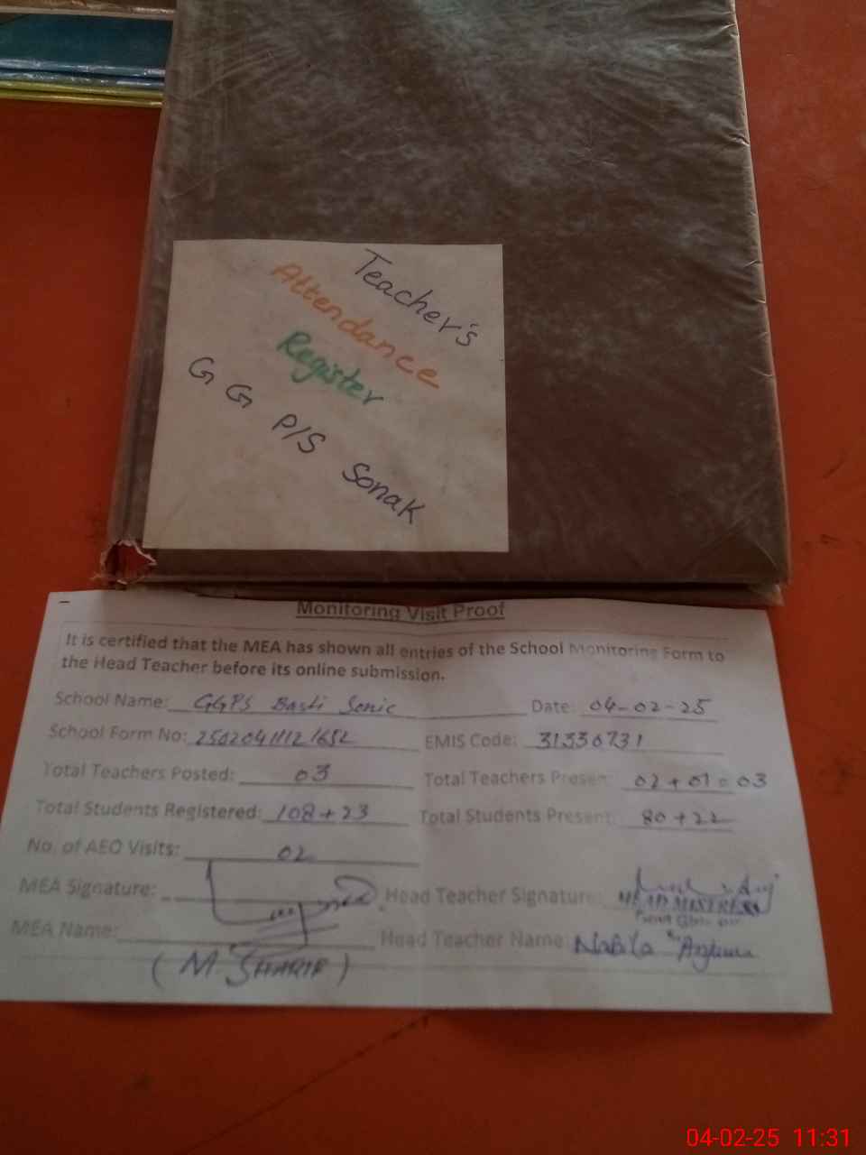 | Attendance Register | Head Teacher | MEA with School | Visit Proof |