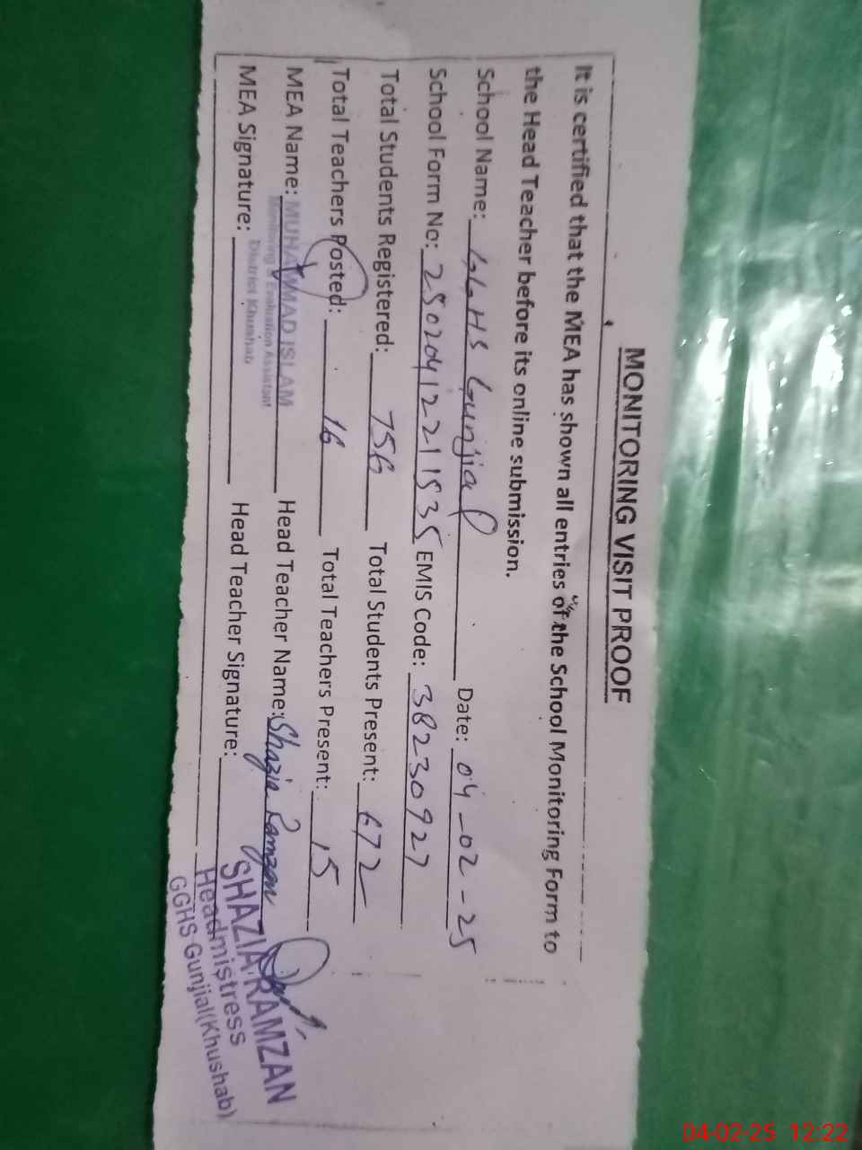 | EMIS Code: 38230927 | Name of School: GGHS GUNJIAL | |||