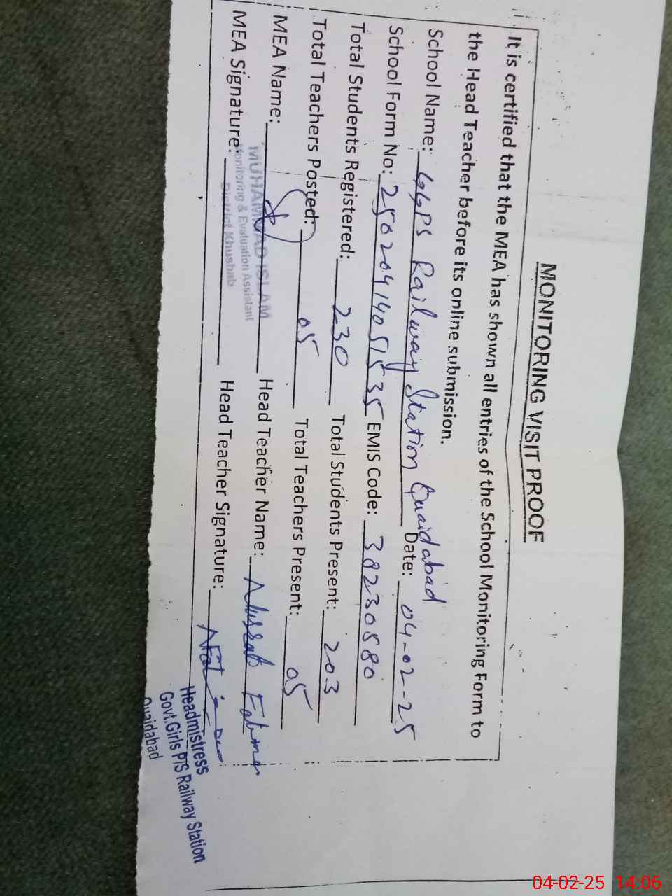 | EMIS Code: 38230580 | Name of School: GGPS RAILWAY STATION QUAIDABAD | |||