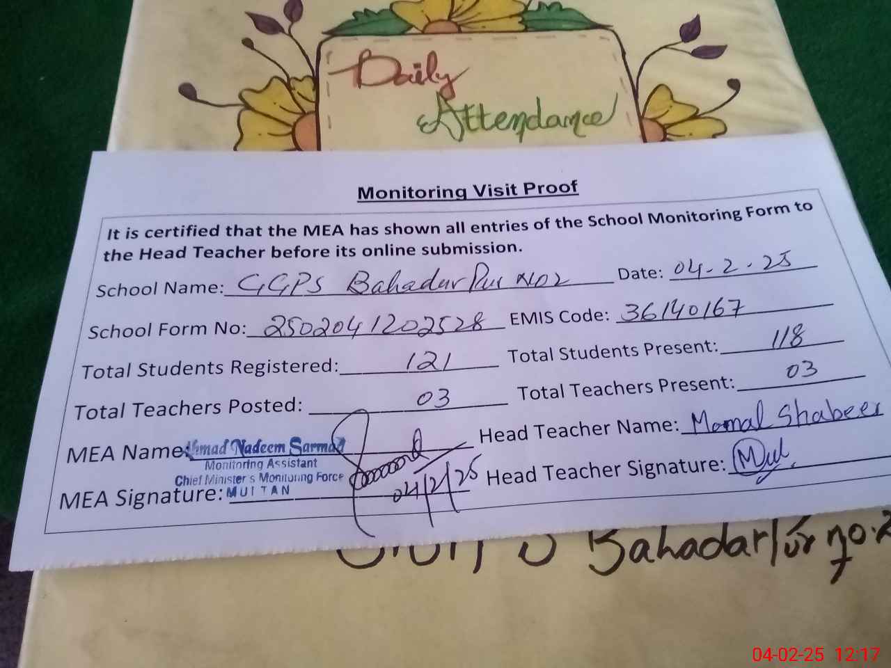 | Attendance Register | Head Teacher | MEA with School | Visit Proof |